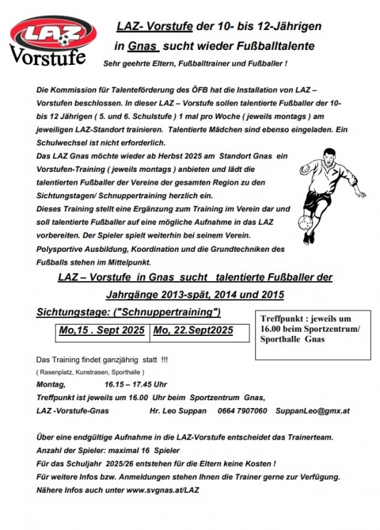 Talentierte Fußballer der Vereine der gesamten Region – auch Mädchen – der Jahrgänge 2013-spät, 2014 und 2015 ( U11 bis U13 ) können bei den Schnuppertrainings am Mo, 15.Sept und Mo, 22.Sept. 2025 , in der Zeit von 16.15 bis 17.45 Uhr auf der Sportanlage in Gnas ihr fußballerisches Können unter Beweis stellen und in die LAZ-Vorstufe aufgenommen werden . Die Vorstufe trainiert einmal in der Woche (montags ) und soll das Vereinstraining ergänzen. Polysportive Ausbildung und die Grundtechniken des Fußballs stehen im Vordergrund. Für die Eltern entstehen keine Kosten. Nähere Infos erhalten Sie bei Hr. Suppan ( 0664 7907060) , Hr. Röck ( 0664 3244707) bzw. unter www.svgnas.at/ LAZ