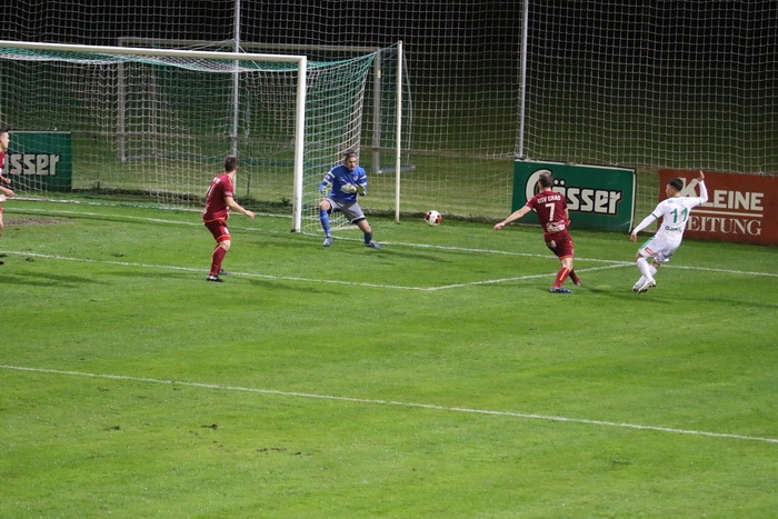 Der Stanglpass von Gjin Gjinaj (nicht am Bild) geht an Freund und Feind vorbei ins Torout (25.).