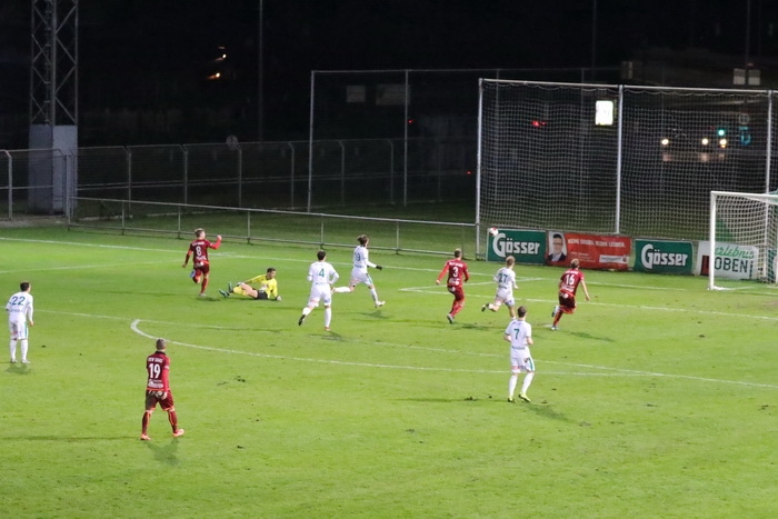Die Kovacevic-Elf konnte aber in der 13. Minute durch Mittelfeldspieler Philipp Scheucher mit 1:0 in Führung gehen. Zuvor scheiterte Kapitän Matthias Schadler mit einem Strafstoß (nach Handspiel) an Torhüter Admir Peckovic, der den Ball zwar aus der Ecke holte, aber nicht bändigen konnte. Scheucher war im Nachschuss erfolgreich.