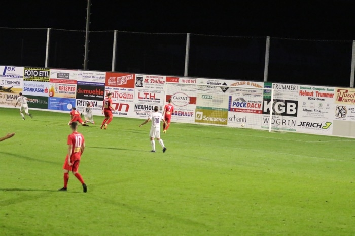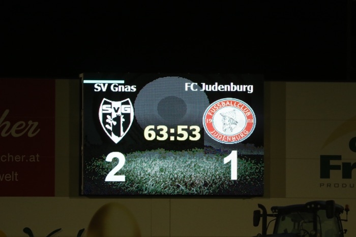 Die Judenburger gaben aber nicht auf und wurden nun gefährlicher. Ein Tor der Gäste wurde in der 72. Minute wegen eines Foulvergehens im Gnaser Strafraum nicht gegeben. Einen Freistoß aus rund 25 Meter von Marc Klicnik konnte Gnas-Torhüter Michael Sammer mit toller Parade über die Querlatte lenken. Nach einem Gnaser Angriff über die linke Seite schoss Justin Horvat am langen Eck vorbei (77.). Auf der anderen Seite kamen die Judenburger über die rechte Seite und eine Flanke beförderte ein Judenburger Angreifer übers Tor von Gnas-Goalie Michael Sammer. Kurz vor Schluss traf Justin Horvat noch die Stange. Nach 95 Minuten Spielzeit beendete Schiedsrichter Kressl die Partie und die Gnaser konnten über drei Punkte jubeln.