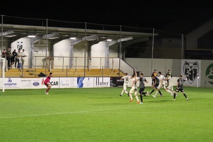 Alex Roth hält einen Volleyschuss von Lucas Friedl (Nr. 22) in der 53. Minute.