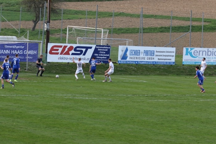 Die Gnaser lieferten den Hartberg Amateuren einen tollen Kampf und ließen in der ersten Halbzeit wenig zu. Ein Freistoß von Daniel Rossmann zog knapp über die Querlatte (6.). Die beste Chance hatten die Gnaser durch Leo Kaufmann, der einen Eckball von Tobias Kölli an die Latte köpfelte (21.). Eine weitere Chance fand Leo Kaufmann in der 36. Minute nach einem schönen Spielzug vor, der gegnerische Torhüter war aber auf dem Posten. Die jungen Hartberger fanden vor allem durch Eckbälle Möglichkeiten vor, konnten aber den Gnaser Goalie nicht bezwingen. Zwingende Chancen der Hausherren gab es in den ersten 45 Minuten nicht. Pausenstand 0:0.