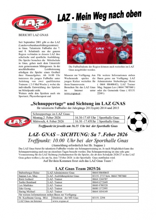 Ab Sommer 2026 können wieder talentierte Fußballer der Region ins LAZ ( Landesausbildungszentrum) Gnas aufgenommen werden.